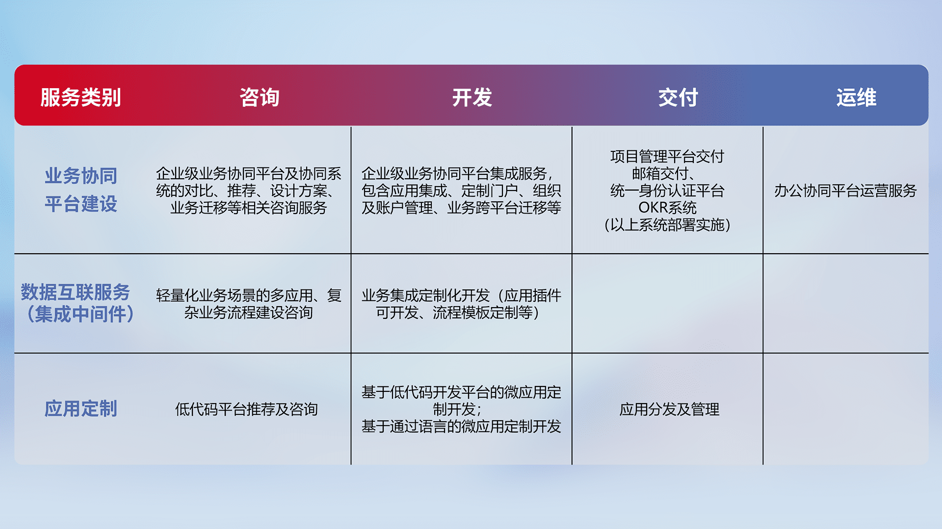 针对钉钉、、、企微、、IDaas等平台级产品提供产品的规划、、、方案、、、、交付、、定制化开发等服务,,实现如统一协同办公、、、、智能客户服务、、、混合会议管理、、智能数据查询、、等业务场景,,实现数字化转型。。