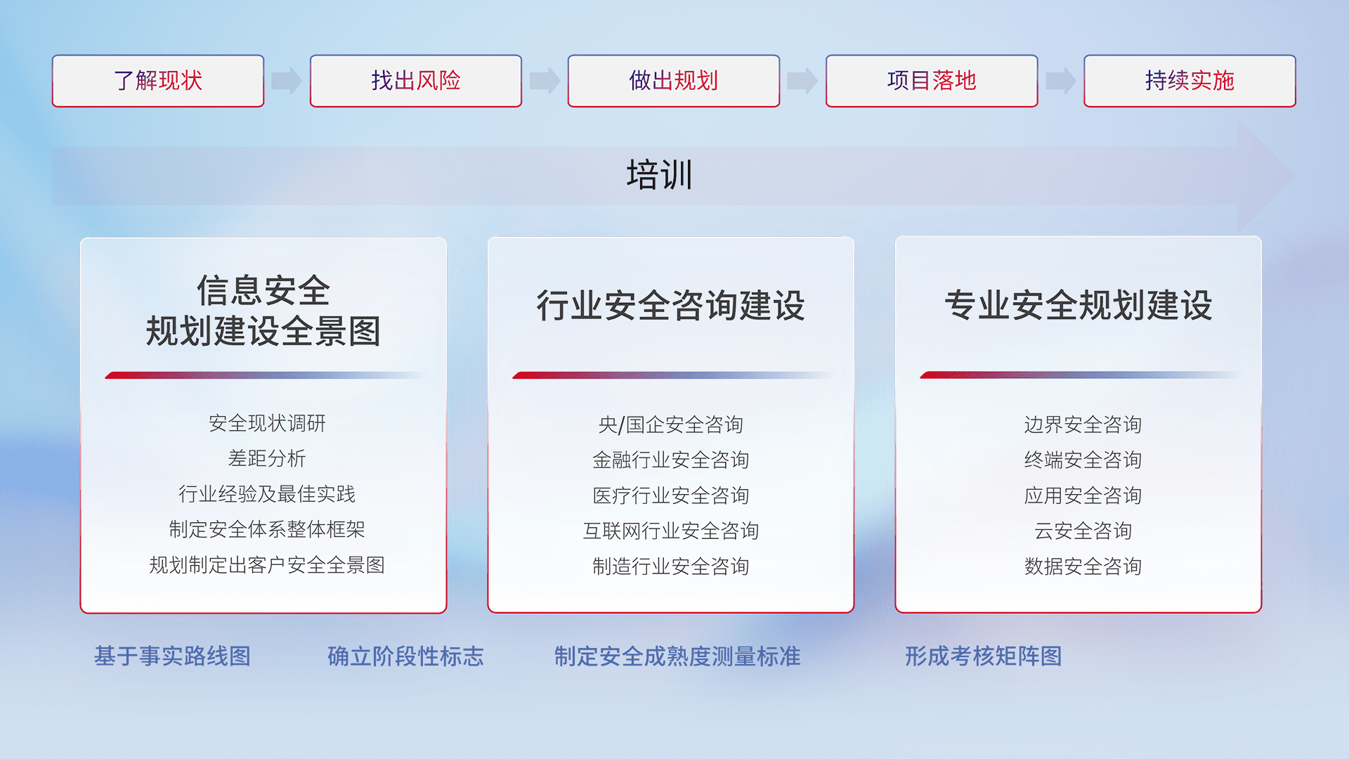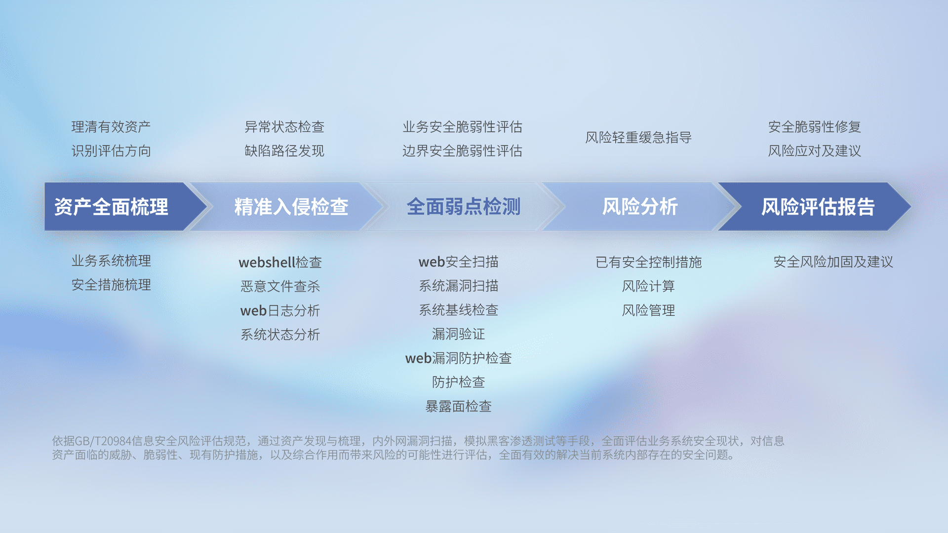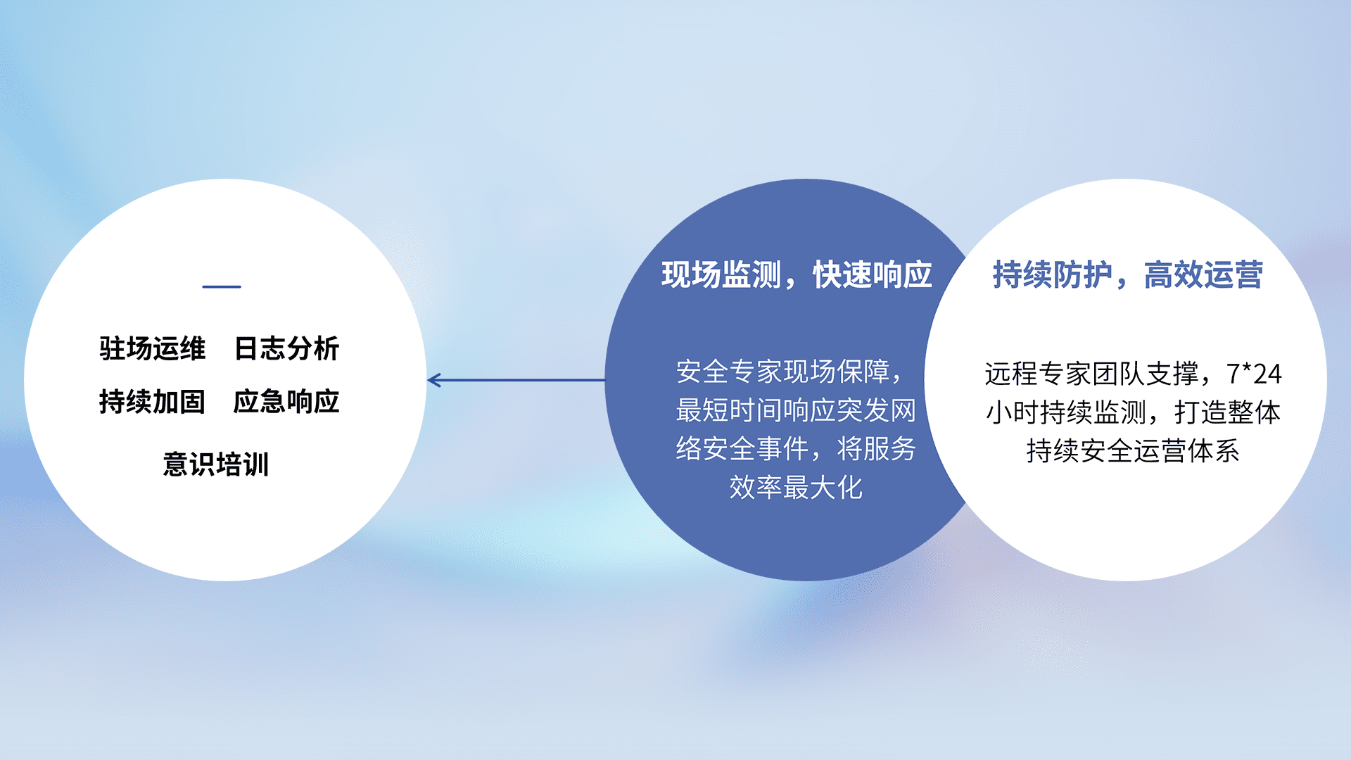 针对客户行业特性,,以专业的安全服务+多厂商联合解决方案提供专属的一站式安全管理服务,,,,帮助客户全面感知网络空间威胁,,,基于识别、、、检测、、、、分析、、、、防护、、、、监测、、、响应的服务理论模型,,从方案咨询、、、集成交付、、评估验证、、、、优化加固、、、运维运营,,,致力于为客户提供完整的闭环管理式安全服务。。。。以实战经验为客户打造高抵御风险的安全体系,,,,帮助客户发现威胁、、对抗威胁、、、、处置威胁,,不断积累安全对抗能力,,,,持续保障数字化安全。。